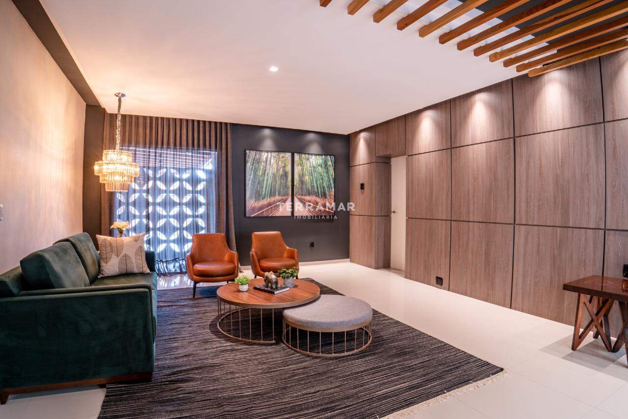 O amplo living com sala de estar, jantar, churrasqueira e cozinha integrados traz um charme todo especial aos ambientes;